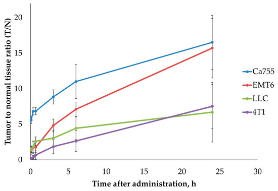 The experiment used several transplantable tumour models that were fast-growing, easy to cultivate both in vivo and in vitro, well-characterised, and commonly used in experimental oncology. All of these selected tumour lines showed a high potential for spreading to other parts of the body and were likely to create an altered blood vessel network around the tumour. Additionally, previous studies have shown that the cell lines LL/2 (LLC1) [23], Ca755 [18], EMT6 [24], and 4T1 [25,26] have a tendency to accumulate specific ligands related to integrin αVβ3 and nucleolin when tested in vivo after grafting. In all studied models, a rapid accumulation of 99mTc-E1b in the tumour was observed in the first 2 h, followed by a gradual decrease within 24 h. However, the decrease in activity in the adjacent healthy tissues was faster, so the value of the tumour-to-normal tissue ratio (T/N) gradually increased during 24 h and reached the maximum at the end point of the observation period. The dynamics of T/N for 99mTc-E1b in four syngeneic tumour models are shown in Table 3 and Figure 4 (see also Supplementary Table S3). At 24 h after drug administration, the highest T/N ratios were observed in EMT6 (15.7 ± 4.2) and Ca755 (16.5 ± 3.8) tumours. LLC (6.7 ± 4.2) and 4T1 (7.5 ± 3.1) tumours showed rather low accumulation and lower T/N ratios 24 h after administration.
