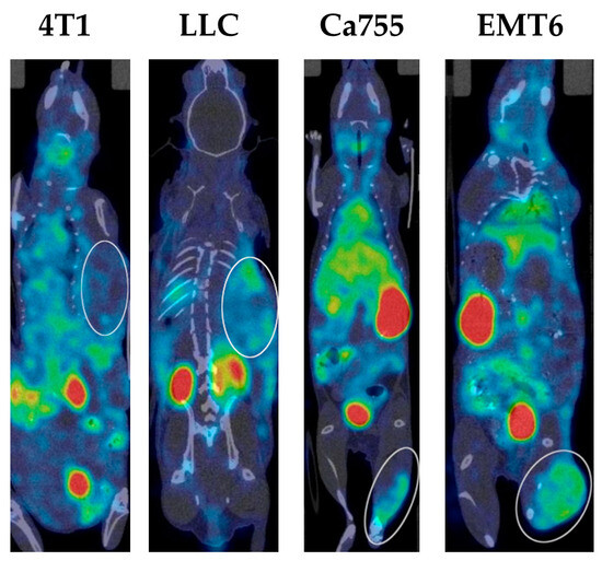 An example of SPECT/CT scan of mice with transplanted tumours at 3 h after 99mTc-E1b intravenous administration. The location of 4T1, LLC, Ca755, and EMT6 tumours is indicated by the white ellipse.