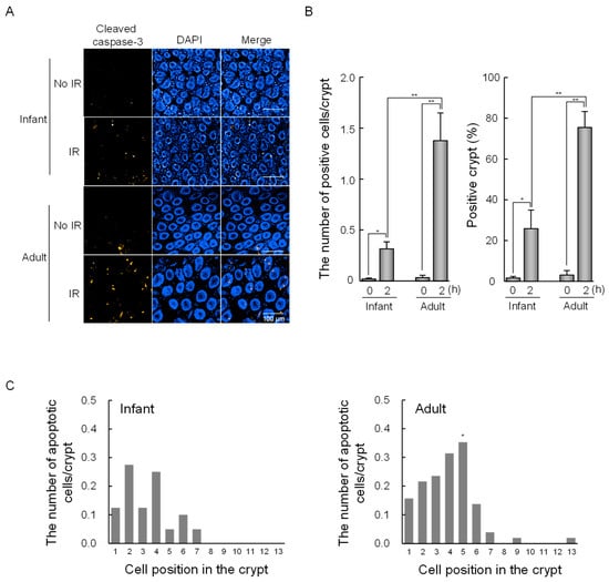 In our previous study, we explored the age-dependent differences in radiation-induced intestinal tumorigenesis in ApcMin/+ mice exposed to gamma-irradiation at 2 Gy. Thus, to explore age-dependent differences in radiation-induced DNA damage responses in intestinal stem cells, we investigated radiation-induced apoptosis in the intestinal crypts of infant (2 weeks old) and adult (8 weeks old) mice exposed to 2 Gy. Apoptotic cells were defined as those containing apoptotic bodies and exhibiting cleaved caspase-3 staining as determined by three-dimensional (3D) image analysis (Figure 1A). As shown in Figure 1B, the number of apoptotic cells per crypt and the percentage of apoptotic crypts increased at 2 h after irradiation in infants and adults, with significantly higher values observed in adults than in infants (Figure 1B). Interestingly, we observed a clear difference in the locations where apoptosis occurred along the length of the small intestinal crypts (Figure 1C). In adult mouse small intestinal crypts, irradiation induced a high frequency of apoptosis around cell position 5. By contrast, in infant crypts, the frequency of irradiation-induced apoptosis was lower, and apoptotic cells were broadly distributed without a specific location at the base of the crypts.