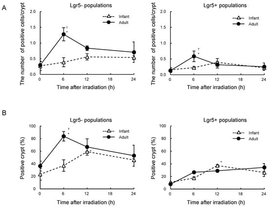 Age-dependent mitotic index after radiation exposure in intestinal crypts from Lgr5-eGFP-ires-CreERT2 mice. (A) Number of phospho-histone H3-positive cells per crypt as a function of time after irradiation. Data are from Lgr5- populations (left) and Lgr5+ populations (right) in the intestinal crypt. Data are presented as means ± SD from three mice. Experiments were performed in duplicates. A one-way ANOVA was used to evaluate differences in means among groups. * p < 0.05 vs. the non-irradiated group. † p < 0.05 vs. the infant group at the same time point after irradiation. (B) Percentage of crypts containing phospho-histone H3-positive cells as a function of time after irradiation. Data are from Lgr5- populations (left) and Lgr5+ populations (right) in the intestinal crypt. Data are presented as means ± SD from three mice. Experiments were performed in duplicates. A one-way ANOVA was used to evaluate differences in means among groups. * p < 0.05 vs. the non-irradiated group. † p < 0.05 vs. the infant group at the corresponding time point after irradiation.