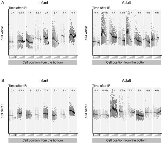 Average p53 immunofluorescence intensity in mouse intestinal crypts as a function of time after irradiation. (A) Quantification of p53 intensity across the intestinal crypts of mice treated with irradiation and analyzed at the indicated time points. (B) Quantification of phospho-p53 intensity across the intestinal crypts of mice treated with irradiation and analyzed at the indicated time points. (A,B) Data are from infant (left) and adult (right) mice. Bold bar shows mean and 95% confidential intervals. Dots represent individual cells. Experiments were performed in duplicates.
