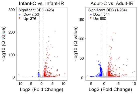 Volcano plot of DEGs between non-irradiated and irradiated groups from infant (left) and adult (right) stem cell populations. Red dots, upregulated DEGs; blue dots, downregulated DEGs; grey dots, nonsignificant DEGs.