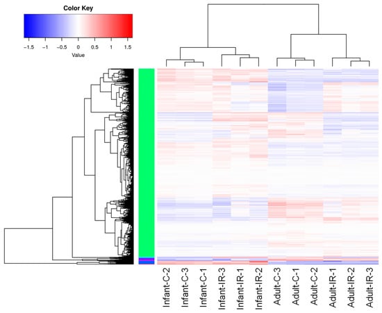 Heatmap of DEGs from the infant non-irradiated (Infant-C), infant irradiated (Infant-IR), adult non-irradiated (Adult-C), and adult irradiated (Adult-IR) groups. The color keys of blue (low), white (medium), and red (high) represent the express levels of different genes. Their expression patterns can be classified mainly into six clusters.