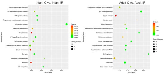 Bubble charts of the KEGG classifications of assembled DEGs. Top 15 enriched KEGG pathway analysis on DEGs after irradiation in infant (left) and adult (right) stem cell populations. The number of DEGs enriched in the pathway is indicated by circle size. The Rich factor is the ratio of the number of DEGs annotated in a pathway to the number of all genes annotated in this pathway. The color saturation from green to red indicates the Q value.