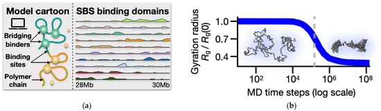 (a) In the SBS model, a chromatin region is represented by a self-avoiding polymer chain along which specific binding sites are arranged for diffusing cognate molecular binders. By bridging cognate sites on the chain, the binders drive the folding of the polymer-forming microphase-separated globular structures. The SBS binding domains of the studies LTN1 locus (Chr21:28–30 Mb) in human WTC-11 cells are shown along with a schematic cartoon of the polymer model. (b) The polymer gyration radius Rg is shown here as a function of the MD time iteration steps (y-axis normalized by the Rg value at t = 0). The function exhibits a sharp drop around 105 time steps, signaling the collapse of the chain from an initial coil (i.e., randomly folded) to an equilibrium globule conformation [140]. A representative coil and phase-separated globule 3D structures are shown, respectively, below and above the phase transition point (gray shaded line in the figure).
