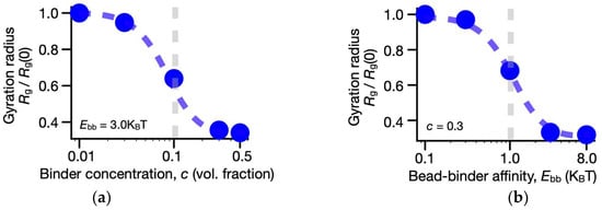 To test model robustness, we sampled a broad range of bead-binder affinity values in the weak biochemical energy scale, from 0 to 8 KBT, and explored up to three orders of magnitude in binder concentration as detailed in previous studies [61,127,150]. As explained above, the number of binders (or their energy affinities) serves as a key control parameter in the model folding, sharply driving its switch-like conformational change from the initial coil to the equilibrium phase-separated globular state, consistent with classic results of polymer phase transitions (Figure 2) [140]. For each set of parameters, we performed up to 3 × 102 independent runs to ensure statistical strength.