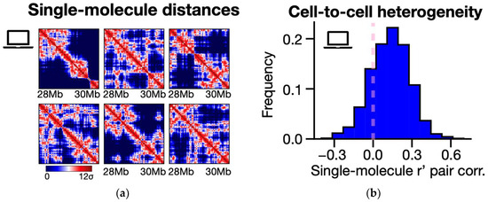 (a) Representative examples of model-predicted phase-separated single-molecule distance matrices of the LTN1 locus. The interaction patterns broadly differ across the ensemble of polymer configurations, as the system can fold in a variety of 3D architectures [127]. (b) The structural heterogeneity of individual polymer structures is measured in the model by computing the r’ correlation between pairs of single-molecule distance matrices. The resulting distribution is broad (variance = 0.15) and has a non-zero average value (mean = 0.13), indicating that chromatin structures are highly variable from cell to cell yet have a residual degree of structural correlation.
