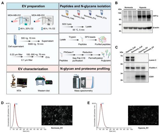 EV isolation and characterization. (A) Workflow for preparing EVs and conducting mass spectrometry for proteomic and N-glycomic analyses of EVs and cells. Key steps include enrichment of EVs secreted under normoxic or hypoxic conditions, isolation of peptides and N-glycans, EV characterization, and mass spectrometry analysis. (B) Western blot of hypoxic marker HIF1α in normoxic and hypoxic cell lysate. (C) Western blot of EV markers CD81, Flotillin-1, and Lamin C in normoxic and hypoxic EV lysate and cell lysate. (D,E) Size and concentration of EVs secreted under normoxia or hypoxia for MDA-MB-231 cell line, as measured by NTA. Histogram showing the calculated mean ± SD of size distribution by NTA analysis of normoxic and hypoxic EV. Red error bars indicate ± 1 standard error of the mean. Screenshots from video recorded using NanoSight LM14, showing the distribution of EVs from the cellulose-supernatant culture under normoxia or hypoxia. Three biological replicates were used for each condition.