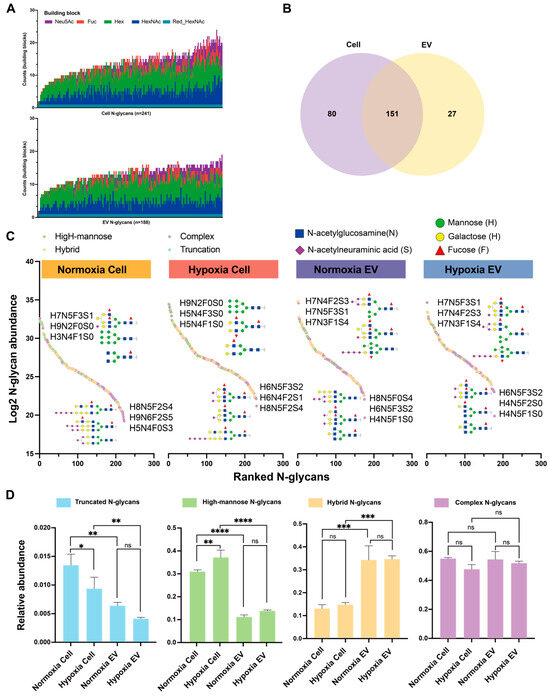 Overview of the N-glycome profiles of EVs and cells under normoxic and hypoxic conditions of the MDA-MB-231 cell line. (A) The stacked bar chart of identified N-glycan compositions in cells (n = 6) and EVs (n = 6). The counts indicate the number of each monosaccharide building block present in the N-glycan structures. (B) A Venn diagram illustrating the number of N-glycans shared between cells and EVs. (C) All quantified N-glycans are plotted, depicting their log-transformed relative abundances against their rank within the dynamic range. (D) Distribution of common N-glycosylation features in cells and EVs under normoxic and hypoxic conditions. Significant values are marked with ns (no significant), * (p ≤ 0.05), ** (p ≤ 0.01), *** (p ≤ 0.001), or **** (p ≤ 0.0001).