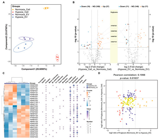 To investigate the differential impact of normoxic and hypoxic conditions on the N-glycomic profiles of cells and their secreted EVs, a multivariate analysis was conducted using partial least squares discriminant analysis (PLS-DA) (Figure 3A). The PLS-DA showed a clear separation of the cells and EVs under hypoxic and normoxic conditions, with component 1 accounting for 29.61% and component 2 explaining 33.88% of the variance (Figure 3A). The univariate analysis using Student’s t-test identified 28 altered N-glycan species between the normoxic and hypoxic EVs (p < 0.05; fold change > 1.5; q-value < 0.05) (Figure 3B; Table S3). Among them, 17 N-glycans were more abundant, and 11 were less abundant in the hypoxic EVs compared to the normoxic EVs. Interestingly, four differentially abundant N-glycans were shared between the dysregulated N-glycans in the cells under normoxic and hypoxic conditions and abnormal N-glycans in the EVs under normoxic and hypoxic conditions (Figure 3B). These N-glycans were less abundant in the hypoxic cells and EVs compared to their normoxic counterparts and contained fucose residues. Specifically, N-glycan H4N6F5S1 was modified to N-glycan H4N6F5S0 through the addition of a sialic acid residue. These statistically differentially expressed N-glycans were further analyzed using Pearson’s correlation and glycosylation features. Most of the differentially abundant N-glycans in the EVs consist of complex glycan species with fucose residues [0–5], sialic acid [0–5], galactose [0–5], bisecting GlcNAc [0–1], Lewis [0–2], and sLewis [0–2] (Figure 3C). In addition, a truncated N-glycan containing fucose resides and a glucose was lower in abundance in the hypoxic EVs, and a bi-antenna complex glycan with a poly-LacNAc epitope was lower in abundance. Interestingly, four hybrid N-glycans containing unique structural moieties were found to be higher or lower in abundance in hypoxia_EV. Furthermore, the cellular dysregulated N-glycans contained several specific structural glycosylation features (Figure S2). By distinguishing between the cellular and vesicular N-glycan expression patterns under hypoxia, the association analysis of the N-glycome data revealed a Pearson’s correlation coefficient of 0.1998 (p-value = 0.01637) (Figure 3D). These results explain that the abundance of most cellular differentially abundant N-glycans did not correlate with the corresponding vesicular N-glycans.