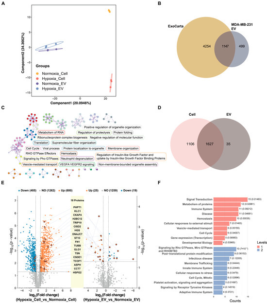Proteomic analysis of EVs and cells under normoxic and hypoxic conditions. (A) Scatter plot of PLS-DA analysis of proteome profiles of normoxia_Cell (yellow circles), hypoxia_Cell (orange circles), and normoxia_EV and hypoxia_EV (purple and cyan squares). Symbols and ellipses indicate each sample and the 95% confidence interval of the four clusters. R2Y = 0.661; Q2Y = 0.574; p = 0.05. (B) Venn diagram showing comparison of protein groups identified in MDA-MB-231 cell EVs by LC–MS/MS with ExoCarta, a public EV proteomics database. Overlapping parts represent shared proteins, and non-overlapping parts represent unique proteins. (C) The network displays enriched biological pathways identified from EV proteome using Metascape. Nodes represent enriched terms, edges denote similarities, and colors indicate cluster IDs, highlighting different functional groups. (D) Venn diagram shows protein groups identified in cells and EVs using LC–MS/MS procedures (n = 6 per group). (E) Volcano plots showing differentially expressed proteins between normoxic and hypoxic conditions in both cells and EVs (p < 0.05 and fold change > 1.5; q-value < 0.05). The left panel presents a volcano plot of differentially expressed proteins between normoxic and hypoxic cells, while the right panel shows the differentially expressed proteins between normoxic and hypoxic EVs. The central diagram highlights the overlapping differentially expressed proteins identified in both conditions. (F) The top 20 entries of the Reactome pathway enriched for levels 1 and 2 by the differentially expressed proteins between normoxic and hypoxic EVs. Levels 1 and 2 indicate distinct biological themes enriched in the dataset.