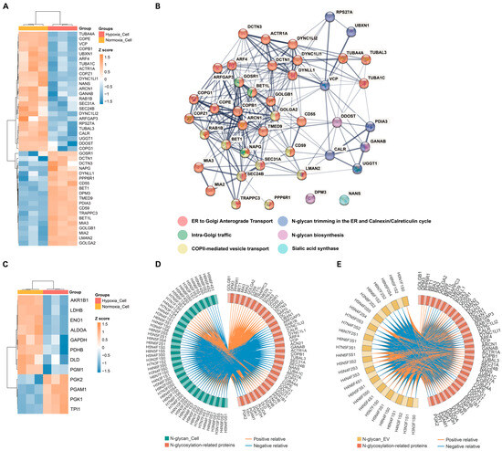 The expression profile and functional enrichment of glycosylation-related proteins in normoxic and hypoxic cells. (A) Heatmap of the differentially expressed “Asparagine N-linked glycosylation” proteins in hypoxic cell compared to normoxic cell. (B) STRING network analyses of significant differentially abundant proteins involved in asparagine N-linked glycosylation. (C) Heatmap of the differentially expressed glycolysis/gluconeogenesis proteins in hypoxic cell compared to normoxic cell. (D,E) Correlation Circos plot of differentially expressed N-glycans in EVs and cells under normoxic and hypoxic conditions and dysregulated N-glycosylation-related proteins in cells. Pearson coefficient cut-offs set at ≥0.8 or ≤−0.8. Blue lines represent negative correlations, while orange lines represent positive correlations.