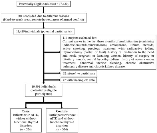 Adult participants (≥18 years) were recruited from the study population in a period from June 2018 to December 2023. All patients diagnosed with AITD, with or without functional alterations of the thyroid (euthyroidism, hypothyroidism, hyperthyroidism), were included as a “case” group (n= 524), and the participants (from the same population from which the cases were chosen) without AITD and with normal thyroid function were included as the “control” group (n = 524) (Figure 1).