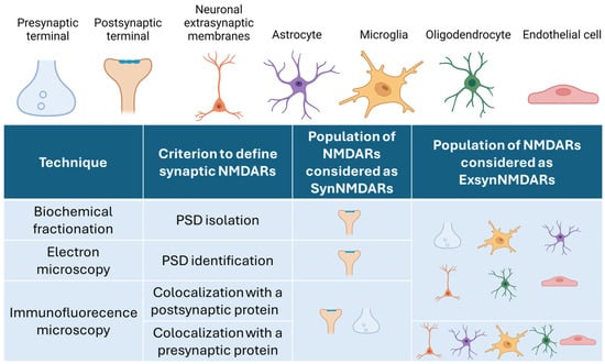 Furthermore, it is important to note that ExsynNMDARs may also refer to non-neuronal NMDARs, expressed by astrocytes [,,], microglia [,,], oligodendrocytes [], and endothelial cells [,].