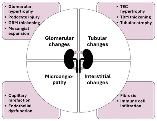 Structural changes in the diabetic kidney. GBM—glomerular basement membrane; TEC—renal tubular epithelial cells; TBM—tubular basement membrane.
