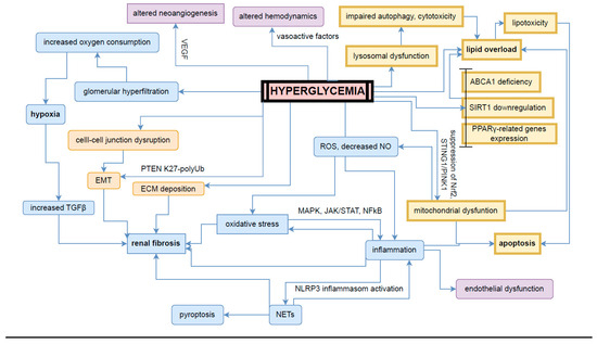 Mechanisms of hyperglycemia in diabetic kidney disease. VEGF—vascular endothelial growth factor; PTEN K27-polyUb—phosphatase and tensin homolog (PTEN) K27-polyubiquitinated; TGF-β—transforming growth factor β; NLRP3—NLR family pyrin domain containing 3; MAPK—mitogen-activated protein kinases; JAK/STAT—Janus kinase/signal transducers and activators of transcription; NFκB—nuclear factor kappa-light-chain-enhancer of activated B cells; NETs—neutrophil extracellular traps; EMT—epithelial–mesenchymal transition; ROS—reactive oxygen species; NO—nitric oxide; ECM—extracellular matrix; STING/PINK1—stimulator of interferon genes/PTEN-induced kinase 1; ABCA1—ATP-binding cassette sub-family A member 1; SIRT1—sirtuin 1; PPARγ—peroxisome proliferators-activated receptor γ; Nrf2—nuclear factor erythroid 2-related factor 2.