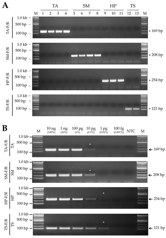 (A) PCR amplicons produced using species-specific SCAR markers developed in this study. (B) Sensitivity analysis of SCAR markers using serially diluted template DNA. NTC, non-template control; *, minimum detectable DNA concentration for each SCAR marker. The SCAR marker names (TA-F/R, SM-F/R, HP-F/R, and TS-F/R) presented on the left of the gel images correspond to the primer information listed in Table 1, and details of the mantis DNA sample (TA, SM, HP, and TS) are listed in Table 4. Numbers on the right indicate amplicon sizes. M, 100 bp DNA ladder with band sizes as indicated.