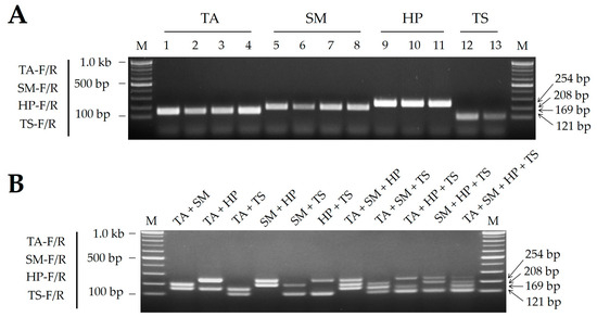 (A) PCR amplicons produced using the multiplex SCAR assay developed in this study. (B) Discrimination capacity of multiplex SCAR assay. DNA from 2 to 4 mantis species was combined and used as template. All PCRs used all four species-specific primer pairs (TA-F/R, SM-F/R, HP-F/R, and TS-F/R), with the template DNA samples indicated above the gel image. Details of the mantis DNA samples (TA, SM, HP, and TS) are listed in Table 4. M, 100 bp DNA ladder with band sizes as indicated. Numbers on the right indicate amplicon sizes.