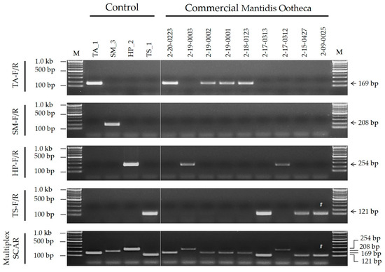 Analysis of commercial Mantidis Ootheca products using both species-specific and multiplex SCAR assays. The SCAR marker names (TA-F/R, SM-F/R, HP-F/R, and TS-F/R) presented on the left of the gel images correspond to the primer information listed in Table 1. Details of control and commercial samples are listed in Table 4 and Table S2, respectively. M, 100 bp DNA ladder with band sizes as indicated; #, counterfeit commercial products according to the country of distribution.