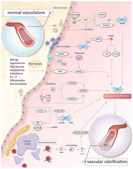 Vascular calcification (VC) manifests as an unusual accumulation of mineral substances containing calcium and phosphate, mainly in the form of hydroxyapatite. According to the major calcifying site of the vascular wall, VC typically involves endometrial calcification and media calcification, which are based on different mechanisms [6]. Endometrial calcification is common in individuals with arteriosclerosis, whereas media calcification is common in patients with CKD and diabetes. The main manifestation is a change in the phenotype of smooth muscle cells (SMCs). Specifically, SMCs transdifferentiate from the contractile phenotype to the osteoblastic phenotype. At the same time, the expression of contractile phenotypic marker genes such as smooth muscle 22 alpha (SM22α) and α-smooth muscle actin (α-SMA) decreases, while the expression of bone morphogenetic protein (BMP2), osteopontin (OPN), runt-related transcription factor 2 (Runx2), and other osteogenesis markers increases [7]. This process is dominated by SMCs, but a variety of other cell types, such as endothelial cells (ECs), macrophages, circulating progenitors, pericytes, and vascular outer membrane fibroblasts, actively participate in the process. In addition, a variety of risk factors, molecular mechanisms, and signaling pathways constitute a complex signaling network for regulation (Figure 1) [8].