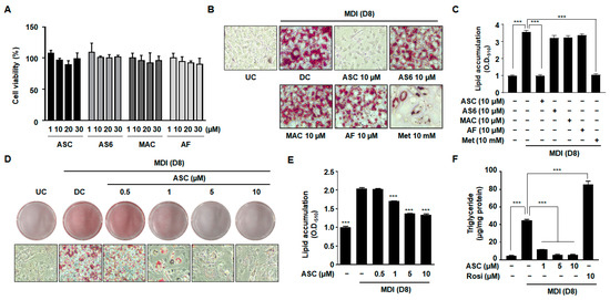 3T3-L1 preadipocyte cells were obtained from the American Type Culture Collection (Manassas, VA, USA). The cells were incubated in DMEM (HyClone; GE Healthcare Life Sciences, Logan, UT, USA) supplemented with 10% bovine serum (BS, Gibco BRL, Grand Island, NY, USA), penicillin–streptomycin, and 1% antibiotic mixture in an atmosphere of 5% CO2 at 37 °C. The medium was subsequently changed every 2 days with DMEM containing 10% BS. Adipocyte differentiation was initiated by replacing the medium with DMEM supplemented with 10% fetal bovine serum (FBS, Gibco BRL), 0.1 mM isobutylmethylxanthine (IBMX, Sigma, St. Louis, MO, USA), 1 mM dexamethasone (Sigma), and 5 µg/mL insulin (Sigma, human, Roche) on day 0, two days after the cells had reached confluence. ASC and associated compounds were added only once at the time of MDI treatment (day 0–2), and the medium was replaced with DMEM containing 10% FBS and 5 µg/mL insulin every 2 days without further addition of the compounds (day 3–4). Then, the medium was changed to only DMEM containing 10% FBS for the last 4 days (day 5–8). This single treatment protocol was used to evaluate the inhibitory effects of ASC on adipocyte differentiation and lipid accumulation. Morphological changes began on day 4, progressing into mature adipocytes, and the cells were incubated for a total of 8 days. ASC (≥98% HPLC) was obtained from Chugai Pharmaceutical (Tokyo, Japan). A stock solution of ASC (10 mM) was prepared in DMSO, stored at −20 °C, and diluted in medium prior to use. Densitometric analysis was performed on scanned Western blot and IHC images using ImageJ software (version 2018; National Institutes of Health, Bethesda, MD, USA).