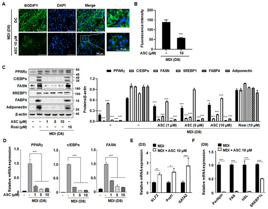 Effect of ASC on lipid accumulation and lipogenic gene expression in 3T3-L1 cells. (A) Representative image of BODIPY-stained lipid droplets in DC- or ASC (10 µM)-treated mature 3T3-L1 adipocytes. (B) Densitometric analysis of each BODIPY fluorescence ratio was performed using ImageJ (version 2018). (C) Two-day post-confluency preadipocytes were incubated with differentiation medium in the presence of ASC (0, 1, 5, and 10 µM). Western blotting of the cells treated with a series of doses of ASC as indicated for PPARγ, C/EBPα, FASN, SREBP1, FABP4, and adiponectin. Protein expression was quantified using ImageJ software and normalized against β-actin as a loading control. (D) The expression of PPARγ, C/EBPα, and FASN was evaluated by qRT-PCR with specific primer pairs on D8. (E) The expression of KLF2, Pref1, and GATA2 was evaluated by qRT-PCR on D2. (F) The expression of Perillipin, FAS, HSL, and SREBP1c was evaluated by qRT-PCR on D8. The relative qRT-PCR values were corrected to expression levels and normalized with respect to the control. Data represent the mean ± SD of three independent experiments. * p < 0.05, ** p < 0.01, *** p < 0.001 compared to the DC.