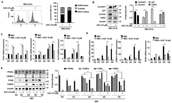 Effect of ASC on MCE and adipogenic differentiation in 3T3-L1 cells. Cells were differentiated according to the standard protocol. (A) Flow cytometry analysis of cells treated with MDI and 10 µM ASC for 18 h. (B) Cellular extracts were isolated and analyzed for the expression of the proteins indicated by Western blotting. Protein expression was quantified using ImageJ software and normalized against β-actin as a loading control. (C) Two-day post-confluency preadipocytes were incubated with differentiation medium in the presence of 10 µM ASC for 48 h. 3T3-L1 cells were subjected to adipocyte differentiation and harvested on day 0, 2, 4, 6, and 8 for qRT-PCR. mRNA levels of anti-adipogenesis-associated genes (Pref1, GATA2, and KLF2). (D) Protein levels of pre-adipogenesis-associated genes (PPARγ, c/EBPα, FASN, and FABP4). (E) mRNA levels of pre-adipogenesis-associated genes (PPARγ, c/EBPα, and FAS). Data represent the mean ± SD of three independent experiments. * p < 0.05, ** p < 0.01, *** p < 0.001 compared to the DC.