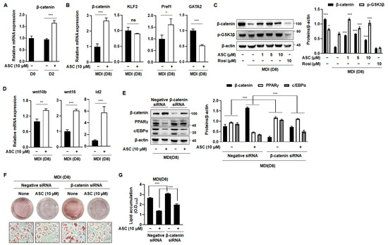The Wnt/β-catenin signaling pathway is a pivotal negative regulator of the transcription factors that are essential for adipocyte differentiation [8]. The activation of Wnt signaling reduces the mRNA and protein expression of C/EBPα and PPARγ, which are crucial for terminal differentiation [20]. Therefore, we investigated the effect of ASC on the expression of β-catenin, a key component of this pathway, which directly regulates adipogenesis. ASC at a concentration of 10 µM significantly increased the mRNA expression of β-catenin in MDI-treated 3T3-L1 cells on D2 (Figure 4A). In addition, we evaluated the effects of ASC on the mRNA expression of anti-adipogenic genes, including β-catenin, Klf2, Pref1, and Gata2, on D8. ASC significantly increased the mRNA expression of β-catenin, but not that of the other genes, on the D8 (Figure 4B). To further explore the impact of ASC on adipogenesis, we analyzed the protein levels of β-catenin and p-Glycogen synthase kinase 3β (GSK3β) in 3T3-L1 cells treated with 1, 5, and 10 µM ASC. The treatment of MDI markedly reduced the protein expression of β-catenin and p-Glycogen synthase kinase 3β (GSK3β) compared to preadipocytes. However, ASC treatment significantly elevated the expression of these proteins (Figure 4C). In addition, ASC increased the mRNA levels of the Wnt signaling pathway including wnt10b, wnt16, and id2 (Figure 4D). These results suggest that the anti-adipogenesis effects of ASC related to the increasing of Wnt/β-catenin signaling pathway on the terminal differentiation.