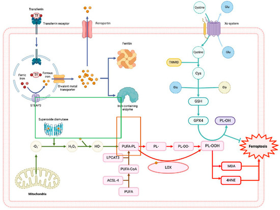 Ferroptosis mechanisms and the system Xc−-GSH-GXP4 pathway. Iron metabolism (blue lines): The transferrin receptor (TRF1) mediates the endocytosis of the ferric iron (Fe3+)-transferrin complex, then the ferric iron is reduced to ferrous iron (Fe++) by the metalloreductase STEAP3, leading to the entrance to the cytosol by the divalent metal transporter (DMT1). In the cytosol, iron can form the labile iron pool (LIP), couple with other enzymes, be stored by ferritin, or be exported by ferroportin (FPN). Lipid metabolism (brown lines): The enzymes ACSL4 and LPCAT3/5 catalyze the formation of membrane phospholipid-containing polyunsaturated fatty acid chains (PUFA-PL). Reactive oxygen species (green lines): Superoxide anion (●O2−) is produced in mitochondria and then is reduced to peroxide hydrogen (H2O2) by superoxide dismutase (SOD). Lipid peroxidation (red lines): The non-enzymatic pathway initiates with the production of hydroxyl radicals (●OH) via Fenton/Haber–Weiss reactions, a ferrous iron-catalyzed H2O2 oxidation process. The ●OH react with PUFAs, which leads to lipid radicals and propagates lipid peroxidation. Lipoxygenase (LOX) is essential for the enzymatic pathway by catalyzing PUFAs into lipid hydroperoxide (PL-OOH). Malondialdehyde (MDA) and 4-hydroxynenanol (4HNE) are the final metabolites of lipid peroxidation. System Xc−–GSH–GPX4 pathway (cyan lines): System Xc−regulates cystine importation and glutamate exportation; cystine is reduced to cysteine by thioredoxin reductase (TXNRD) so it can be used to form glutathione (GSH). The enzyme glutathione peroxidase 4 (GPX4) utilizes GSH to reduce PL-OOH into lipid alcohols (PL-OH) and inhibit lipid peroxidation.