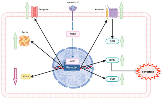 Interleukin 37 (IL-37) and nuclear factor erythroid 2-related factor 2 (Nrf2) pathway. The master regulator of antioxidant response Nrf2 is activated under significant oxidative stress, and IL-37, then it is translocated to induce its target genes in the nucleus. The Nrf2 pathway upregulates proteins of the iron metabolism, superoxide dismutase, and the system Xc−–GSH–GPX4 pathway and downregulates ACSL4. IL-37 can induce the activation and translocation of Nrf2 to the nucleus. Glutathione (GSH), glutathione peroxidase 4 (GPX4), acyl-CoA synthetase long chain family member 4 (ACSL4).