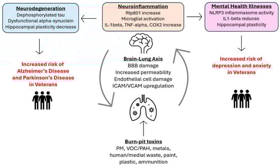 Brooks, A.W.; Sandri, B.J.; Nixon, J.P.; Nurkiewicz, T.R.; Barach, P.; Trembley, J.H.; Butterick, T.A. Neuroinflammation and Brain Health Risks in Veterans Exposed to Burn Pit Toxins. Int. J. Mol. Sci. 2024, 25, 9759. https://doi.org/10.3390/ijms25189759