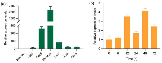 To characterize the expression of OsMBF1a in rice, expression data from developmental tissues of Nipponbare (NIP) were extracted from the Bio-Analytic Resource (https://bar.utoronto.ca/eplant_rice/, accessed on 22 March 2023, Figure S1a) and The Rice Annotation Project Database (https://rapdb.dna.affrc.go.jp/, accessed on 22 March 2023, Figure S1b). The data revealed that OsMBF1a is ubiquitously expressed in various tissues, including leaf, root, stem, inflorescence, anther, pistil, embryo, and endosperm, with the highest expression levels observed in seed, leaf, and inflorescence. To validate these findings, a real-time quantitative reverse transcript PCR (RT-qPCR) was conducted on the NIP stamen, pistil, seed, embryo, and seedling’s leaf, root, and stem. These results confirmed that the highest expression levels were in the embryo and seed (Figure 1a). Given the high expression in seeds, we further analyzed the expression profile of OsMBF1a during seed germination. The results showed that OsMBF1a expression increased to more than 3.5-fold after 12 h of germination and remained at elevated levels until 3 days of germination, although it fluctuated at 24 h (Figure 1b), indicating that OsMBF1a is induced during seed germination.