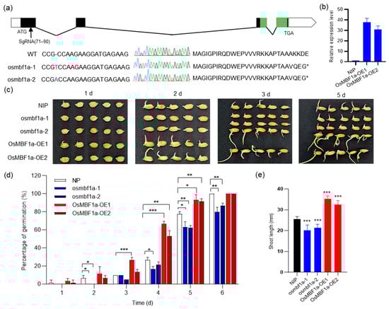 To delve deeper into the function of OsMBF1a in seed germination, we utilized CRISPR/Cas9 technology to mutate the OsMBF1a gene within the NIP genetic background. This resulted in two distinct mutant lines: osmbf1a-1, which has an extra T at base pair 71 bp of the first exon, and osmbf1a-2, with an additional A at the identical location of the OsMBF1a gene (Figure 2a). Both mutations led to the premature termination of amino acids, resulting in the deletion of OsMBF1a’s functional domains (Figure 2a). Concurrently, plants overexpressing OsMBF1a were developed through Agrobacterium-mediated genetic transformation in the NIP background. RT-qPCR analysis confirmed that 11 overexpression lines had markedly elevated levels of OsMBF1a transcripts, with the lines OsMBF1a-OE1 and OsMBF1a-OE2 demonstrating over a 30-fold increase (Figure 2b), indicating successful gene integration and robust transcription. We then evaluated the phenotypes of seed length, seed width, 100-grain weight, and plant height in transgenic lines and found no significant difference between transgenic lines and NIP (Figure S2).