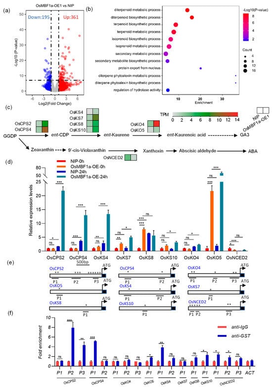 Expression network regulated by OsMBF1a. (a) Volcano plot illustrating differentially expressed genes (DEGs) in plants overexpressing OsMBF1a. (b) Gene Ontology analysis highlighting the enriched biological processes among the DEGs. (c) Schematic representation of the biosynthesis pathway of gibberellin (GA) and abscisic acid (ABA) from geranylgeranyl pyrophosphate (GGPP), with gene expression levels depicted in a heatmap derived from transcriptome data. (d) Expression levels of genes involved in GA and ABA biosynthesis in germinated seeds (0 and 24 h) of OsMBF1a overexpression plants compared to NIP, as determined by transcriptome analysis. (e) Schemes showed the genomic regions of the CTAGA motif of GA and ABA biosynthesis genes in DAP-qPCR. Stars represent the potential binding motifs of OsMBF1a. (f) DAP-qPCR analysis of OsMBF1a association with the promoters of the tested genes. The fold enrichment was calculated as bound/input by normalization with IgG control set as 1. Actin was used as a negative control. The experiments were repeated three times independently, with similar results. Data are presented as mean ± standard deviation (SD) from three biological replicates. Statistical significance was determined using a t-test. * indicates p < 0.05, ** indicates p < 0.01, and *** indicates p < 0.001. NIP, Nipponbare. ACT, actin, ns denotes no significant difference.