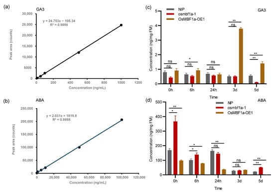 Quantification of ABA and GA content in OsMBF1a transgenic rice lines and Nipponbare (NIP). (a) Linear regression analysis depicting the relationship between the standard concentration of gibberellin 3 (GA3) and its peak area. (b) Linear regression analysis showing the relationship between the standard concentration of abscisic acid (ABA) and its peak area. (c) GA3 content measured in seeds of OsMBF1a transgenic lines at various germination stages. (d) Endogenous ABA content in seeds of OsMBF1a transgenic lines at different germination stages. Data are presented as mean ± standard deviation (SD) from three biological replicates. Statistical significance was determined using a t-test. * indicates p < 0.05, ** indicates p < 0.01, and ns indicates no significant.