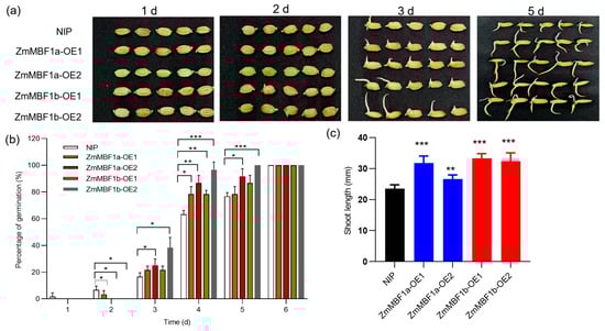 Seed germination phenotypes in ZmMBF1a and ZmMBF1b transgenic rice lines. (a) Comparative images of germinated seeds for NIP (wild-type) and transgenic lines over a period of 1, 2, 3, and 5 days, illustrating the developmental progression post-germination. (b) Cumulative germination rate of NIP and transgenic lines, measured daily for a duration of six days, highlighting the temporal dynamics of seed germination. (c) Quantitative assessment of shoot length for NIP and transgenic lines at the six-day mark post-germination. Data are presented as mean ± standard deviation (SD) from three biological replicates. Statistical significance was determined using a t-test. * indicates p < 0.05, ** indicates p < 0.01, and *** indicates p < 0.001. NIP, Nipponbare; ZmMBF1a-OE1 and ZmMBF1a-OE2, two independent transgenic lines that overexpressed ZmMBF1a; ZmMBF1b-OE1 and ZmMBF1b-OE2, two independent transgenic lines that overexpressed ZmMBF1b.