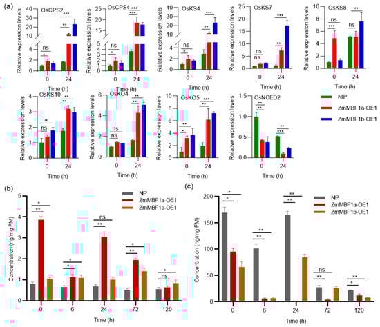 Considering the germination phenotypes of ZmMBF1a and ZmMBF1b, we examined the expression of the nine aforementioned genes involved in GA and ABA biosynthesis in NIP, ZmMBF1a-OE1, and ZmMBF1b-OE1 using RT-qPCR (Figure 6a). The overexpression of ZmMBF1a and ZmMBF1a slightly increases GA biosynthesis gene expression in transgenic rice seeds, with a significantly higher expression observed 24 h post-germination compared to NIP, indicating that transgenic plants facilitate the expression of GA biosynthesis. A corresponding decrease in OsNCED2 expression was noted in overexpressing plants. These findings suggest that ZmMBF1a and ZmMBF1b modulate GA and ABA biosynthesis. An analysis of endogenous ABA and GA content in overexpression lines (ZmMBF1a-OE1 and ZmMBF1b-OE1) during the first 5 days of germination showed significantly higher GA3 content compared to NIP, except at certain time points (Figure 6b). ABA content decreased significantly within 5 days post-germination, with the most notable decrease 6 h post-germination and the lowest levels in ZmMBF1a-OE1 24 h post-germination (Figure 6c). This indicates that ZmMBF1a and ZmMBF1b overexpression can reduce ABA and increase GA content in rice seeds, potentially enhancing germination. The significant increase in GA3 content and the significant decrease in ABA content in ZmMBF1a- and ZmMBF1b-overexpressed plants at the early stage of germination further verified the direct effect of changes in gene expression level on hormone levels. It is worth noting that the increase in GA3 content and the decrease in ABA content showed a certain synchronicity in time, especially within 6 to 24 h after germination, which indicates that the regulatory effect of ZmMBF1a and ZmMBF1b is particularly critical in the early stage of seed germination. In addition, the ABA content of ZmMBF1a-OE1 plants reached the lowest level at 24 h, while the GA3 content remained at a high level, which may be one of the reasons for the stronger germination ability of ZmMBF1a-OE1 plants.