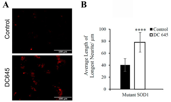 (A) Effects of Ellorarxine (DC645) on MAP2 semi-quantitative immunofluorescent staining of differentiated WT NSC-34 cells, (B) Morphological differentiation of undifferentiated NSC-34 cells determined by quantitative measurement of neurite length (α-MEM). (A) Immunofluorescence revealed MAP2 expression was more prevalent in differentiated cells treated with Ellorarxine than without (representative figure from n = 4 replicates). Imaging was carried out at one magnification, ×20, on the Zeiss Apotome microscope. Cells without any primary antibody were used as a negative control. Scale bars = 100 µm. (B) A significant increase is observed for mutant SOD1 NSC-34 cells cultured with Ellorarxine (10 nM). Data expressed as means ± SD. (n = 10) (**** p < 0.0001).