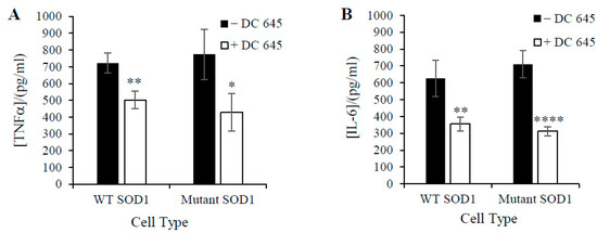 Effects of Ellorarxine (DC645) on TNF-α (A) and IL-6 (B) release of undifferentiated NSC-34 cells incubated with 0.3 µg/mL LPS. NSC-34 cells were pre-treated with 10 nM Ellorarxine for 1 h before 24 h of inflammatory insult with 0.3 µg/mL LPS. Data expressed as means ± SD. (n = 4) (* p < 0.05, ** p < 0.01, **** p < 0.0001).