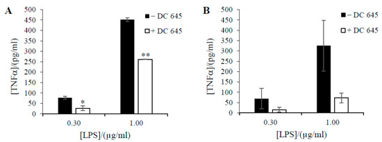 Effects of Ellorarxine (DC645) on TNF-α release of differentiated NSC-34 cells incubated with LPS. Release of pro-inflammatory signal in differentiated wild type (A) and mutant (B) NSC-34 cells with and without a 1-h pre-incubation with Ellorarxine. Data expressed as means ± SD. (n = 4) (* p < 0.05, ** p < 0.01).