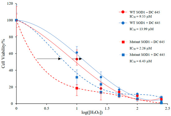 Effects of Ellorarxine (DC645) on the dose response effect of H2O2 on differentiated wild type and mutant SOD1 NSC-34 cells. Cell viability, compared to control, for cells treated with H2O2 for a 24-h incubation (red) and after a 1-h pre-incubation with Ellorarxine (blue). Arrows indicate the change in IC50 when treated with Ellorarxine.