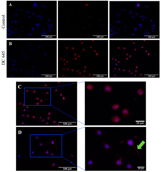 Effects of Ellorarxine (DC645) on GluA2 immunofluorescent staining of undifferentiated and differentiated mutant SOD1 NSC-34 cells. Staining of both untreated (A,C), control, cells, and those treated with Ellorarxine (10 nM) (B,D) for DAPI (left, blue) and GluA2 (centre, red) as well as merged channel images (right). Immunofluorescence revealed GluA2 expression was more prevalent in differentiated cells treated with Ellorarxine than not, with clear expression neurite outgrowths (green arrow). Imaging was carried out at one magnification, ×20, on the Zeiss Apotome microscope. Cells without any primary antibody were used as a negative control. Scale bars = 100 µm.