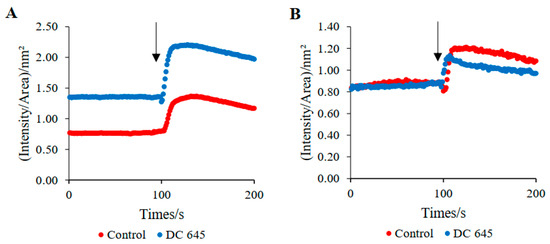 Ca2+ Imaging of differentiated NSC-34 cells: Effects of Ellorarxine (DC645). Changes in normalized fluorescence intensity as a function of time for the average of 10 individual cell body (A), neurite (B). Addition of the depolarizing buffer (KCl) is indicated by an arrow (n = 10).