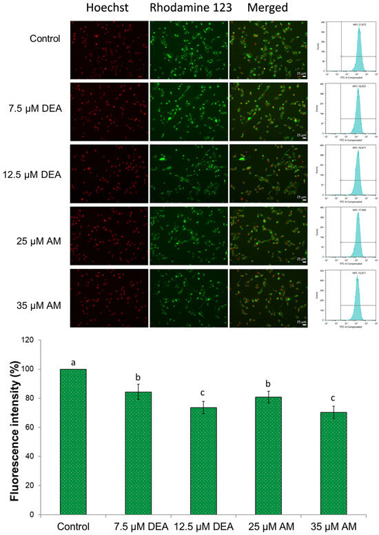 Effects of DEA and AM on ΔΨm of MDA-MB-231 cells. The cells were treated with 0, 7.5, or 12.5 µM DEA or with 25 or 35 µM AM for 6 h before loading them with R-123 dye and taking fluorescent microscopy images, as well as flow cytometry readings. The nuclei were counterstained with Hoechst 33342 (Hoechst). The results are presented as representative microscopy images of the same field in the red and green channels, as well as flow cytometry histograms of cells. The scale bar represents 25 µm. The horizontal and vertical axes of the histograms represent the fluorescence intensity of R-123 on a logarithmic scale of 101–106 arbitrary units and event number on a linear scale of 0–400, respectively. The bar diagram shows the mean fluorescent intensity normalized to the fluorescent intensity of control, mean ± standard error of the mean (SEM) of three independent experiments. The letters above the bars denote groups significantly (p < 0.05) different from the others.