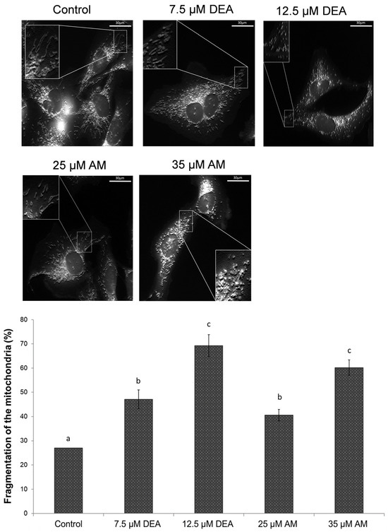 Effects of DEA and AM on mitochondrial network dynamics in MDA-MB-231 cells. The cells were treated with 0, 7.5, or 12.5 µM DEA or with 25 or 35 µM AM for 6 h before loading them with MitoTracker red dye and taking fluorescence microscopy images. Mitochondrial fragmentation was determined as described earlier [29]. The data are presented as representative images and as the percentage of fragmented mitochondria, mean ± SEM of three independent experiments. The scale bar represents 30 µm. The letters above the bars denote groups significantly (p < 0.05) different from the others.