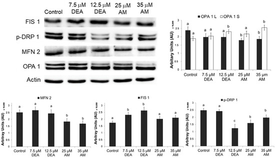 Effects of DEA and AM on proteins regulating the mitochondrial fusion-fission process. MDA-MB-231 cells were treated with 0, 7.5, or 12.5 µM DEA or with 25 or 35 µM AM for 6 h, then homogenates of the cells were subjected to immunoblot analysis. The data are presented as representative blots and as pixel densities of protein bands, mean ± SEM of three independent experiments. The lower-case letters above the bars denote groups significantly (p < 0.05) different from the others of the same set. OPA1 L and S denote the long (active) and short (cleaved, inactive) forms of the protein.