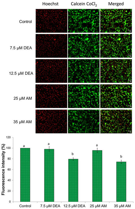 Effects of DEA and AM on mPT in MDA-MB-231 cells. The cells were treated with 0, 7.5, or 12.5 µM DEA or with 25 or 35 µM AM for 6 h before loading them with calcein + CoCl2 and taking fluorescent microscopy images. The nuclei were counterstained with Hoechst. The data are presented as representative merged images of the same field in the red and green channels, and as corrected total cell fluorescence (CTCF) normalized to the fluorescence intensity of the control, mean ± SEM of three independent experiments. The scale bar represents 25 µm. The lower-case letters above the bars denote groups significantly (p < 0.05) different from the others.