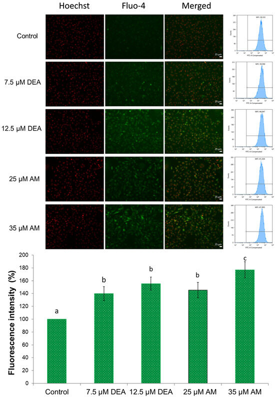Effects of DEA and AM on [Ca2+]i in MDA-MB-231 cells. The cells were treated with 0, 7.5, or 12.5 µM DEA or with 25 or 35 µM AM for 3 h before loading them with Fluo-4AM dye and taking fluorescent microscopy images, as well as flow cytometry readings. The nuclei were counterstained with Hoechst. The results are presented as representative microscopy images of the same field in the red and green channels, as well as flow cytometry histograms of cells. The scale bar represents 25 µm. The horizontal and vertical axes of the histograms represent the fluorescence intensity of Fluo-4AM on a logarithmic scale of 101–106 arbitrary units and event number on a linear scale of 0–300, respectively. The bar diagram shows the fluorescence intensity normalized to the fluorescence intensity of the control, mean ± SEM of three independent experiments. The letters above the bars denote groups significantly (p < 0.05) different from the others.