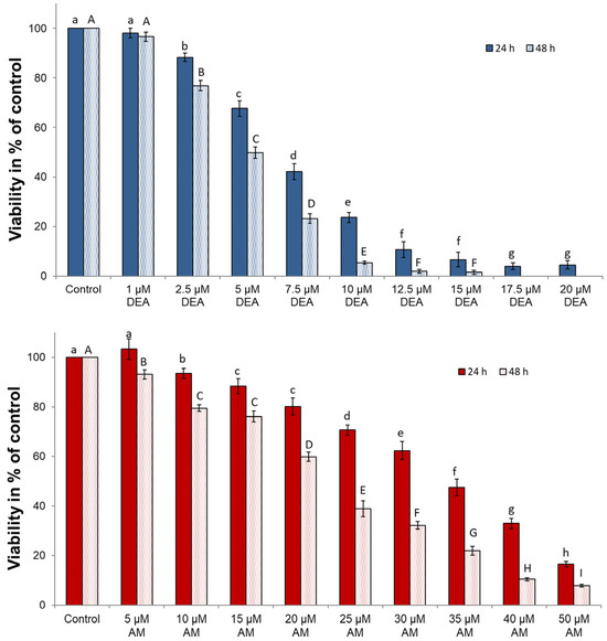 Effects of DEA and AM on the viability of MDA-MB-231 cells. We treated the MDA-MB-231 cells with 0–20 µM DEA or 0–50 µM for 24 h (dark bars) or 48 h (light bars) before measuring their viability using the SRB assay. We presented viability as the percentage of the untreated control, means ± SEM of five independent experiments. The upper and lower-case letters above the bars denote groups significantly (p < 0.05) different from the others.