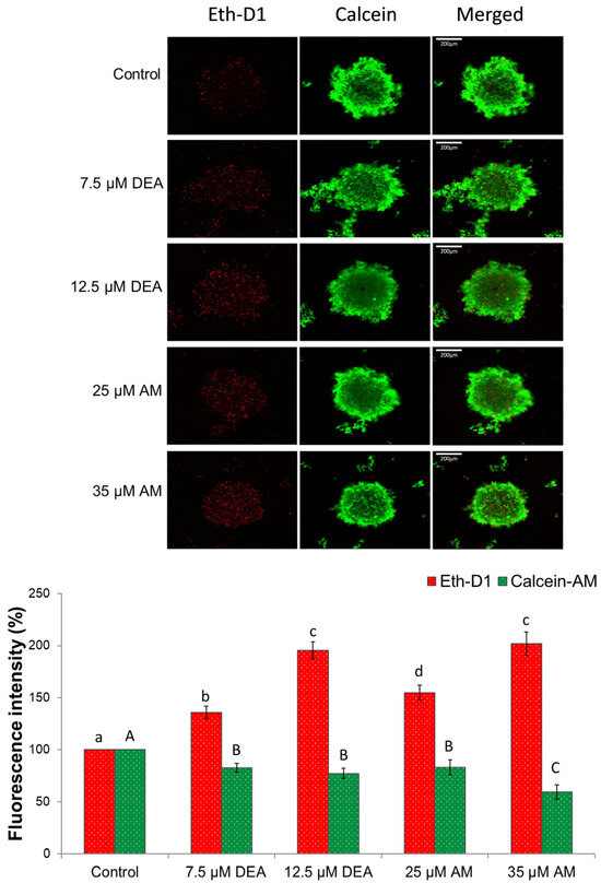 Effects of DEA and AM on the viability of MDA-MB-231 spheroids. We treated the spheroid cultures with 0, 7.5, or 12.5 µM DEA or with 25 or 35 µM AM for 72 h before adding calcein and ethidium homodimer (ETHD) to the medium. Images were captured in the green and red channels of a fluorescence microscope. The results are presented as representative images and bar diagrams of three independent experiments. For the latter, CTCFs were normalized to the total protein content of permeabilized spheroids and were expressed as the percentage of the untreated cultures mean ± SEM. The scale bar represents 200 µm. The upper- and lower-case letters above the bars denote groups significantly (p < 0.05) different from the others of the same set.